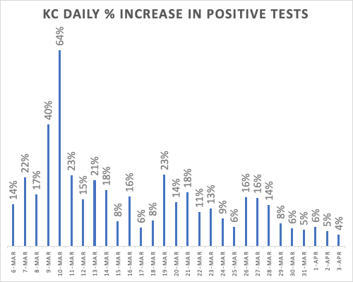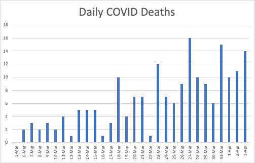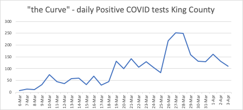 Finally, “the curve” – the absolute number of positive tests per day. It sure looks like we peaked on the 27th-28th of march at 250 per day and now are down to half that. But see my previous note for some reasons even large drops in population cases could take a long time to show up if we don’t get more tests.