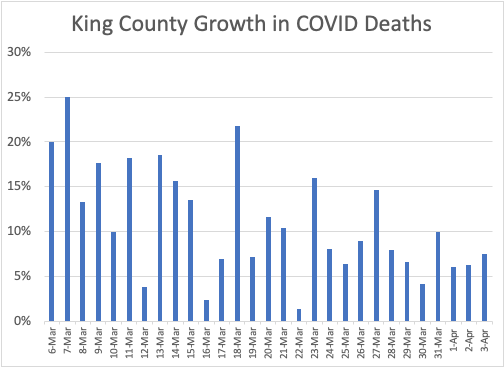 Death growth rate is also dropping, but it’s noisier because our actual death number is so small and noisy. I think this laggiest of measures (deaths today reflect actions we took 25-30 days ago) is probably leveling off, but we’d like to see it start dropping.