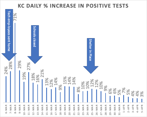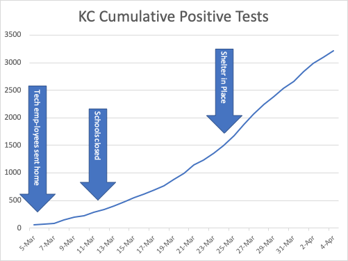 Another day, another update. Continuing yesterday’s trend, I’m updating previous days with new data from KC Health. This is a more accurate and reflects when tests actually happened, not when they came back. I’m also adding major distancing events so you can see when they happened vs. changes in our caseload and deaths.