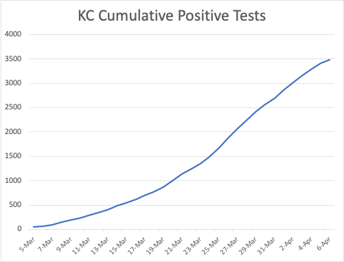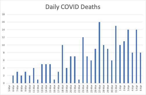 This shows that we added 155 cases to come to 3486. That’s true, but if we dig deeper we find that a number of the additional tests were in fact allocated to previous days. The next graph shows that only 80 of the tests were reported on 4/06, which is the number I report here.