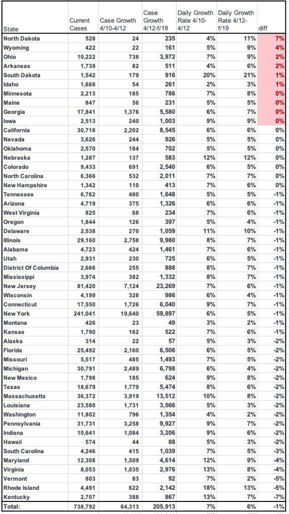 The table below shows the result. Instead of ordering states by cases, I’ve ordered them by whether their case load growth rate is growing or shrinking. Thanks to social distancing, most of the US, and the US as a whole, is slowing down. But a notable group of red states are in fact accelerating their growth rate, which is very dangerous. They’re not just growing faster, their rate of growth is increasing. This in spite of being naturally sparse populations.