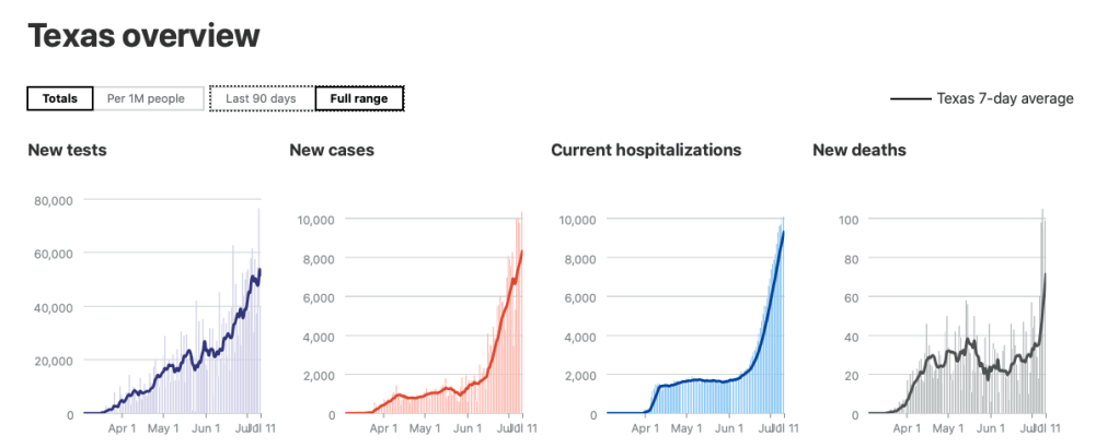Another sign of trouble is the percent of tests coming back positive. If this percent is high, it means the epidemic is outstripping testing, not the other way around. Texas is at 20% of tests positive – an alarmingly high number.