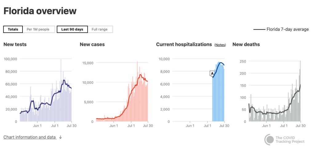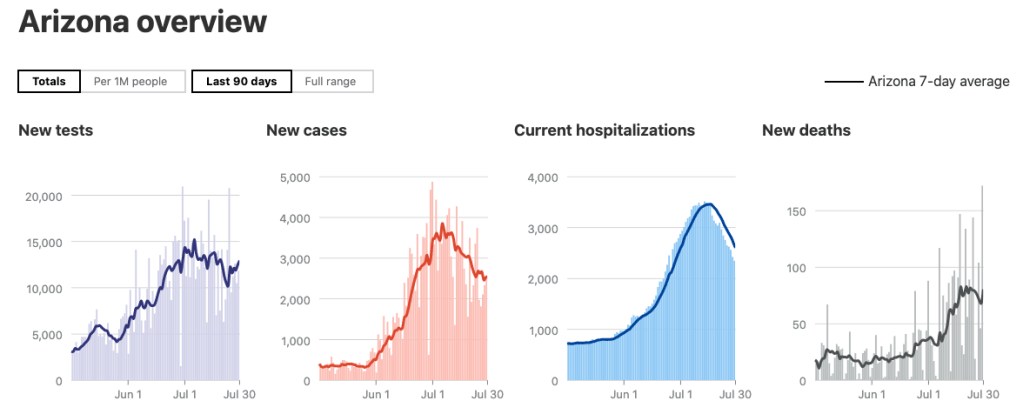 AZ was spiking hugely on all metrics, but new cases appear to have started to turn the corner on July 7 (implying they began to modify behavior in early June). Hospitalizations turned 6 days later on July 13, fitting perfectly. Deaths are a bit vague as they may have turned down but are showing signs of life again, but the first signs were on July 21, 14 days later, a bit early for my model. It would predict that they will have another week of growth ahead of them, hitting 200 deaths per day before that happens, but we’ll see.